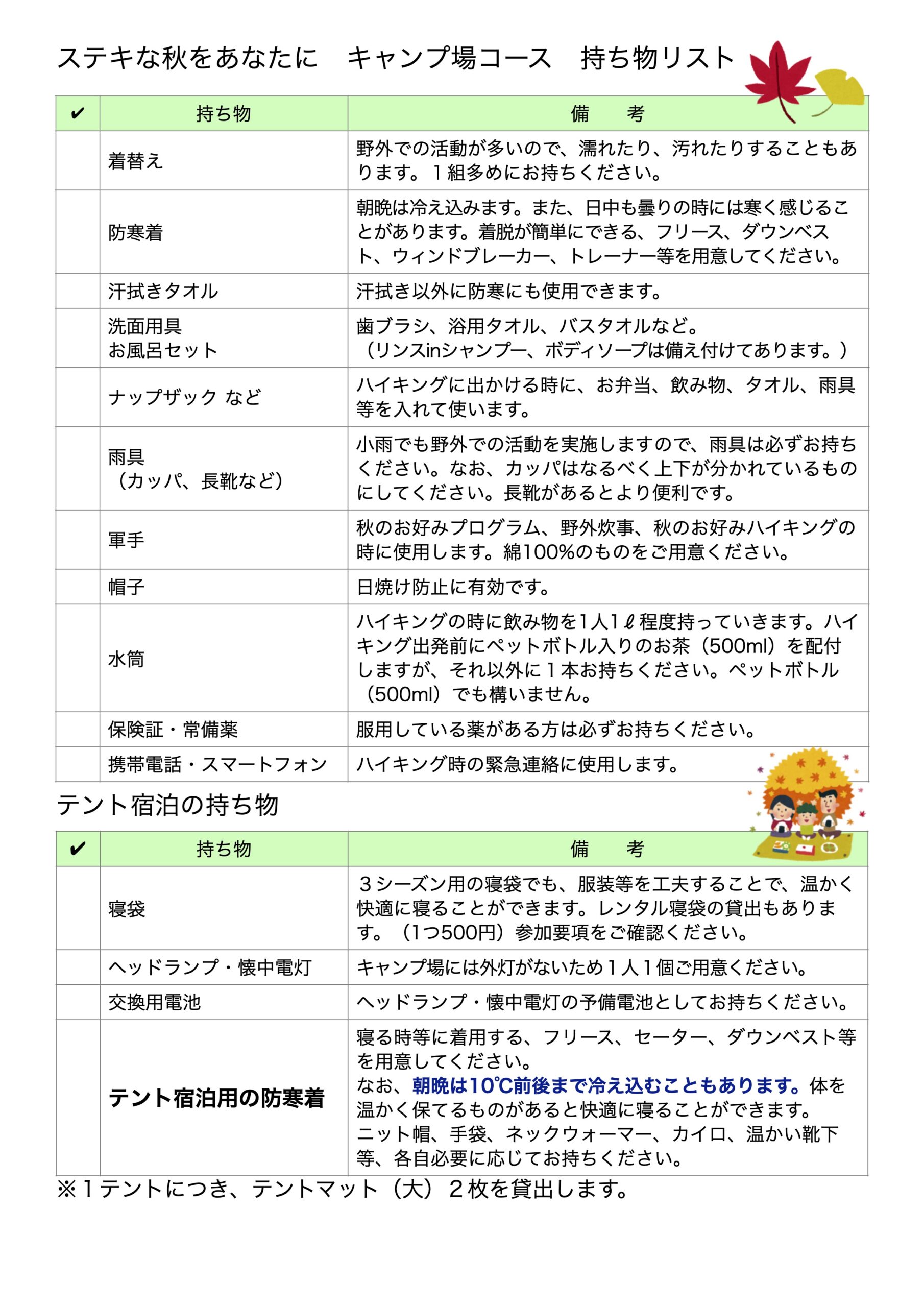 - 「しおり」、「持ち物リスト」は参加コースそれぞれに用意しました。コースにより内容が異なる部分がありますので、必要なものをダウンロードしてください。