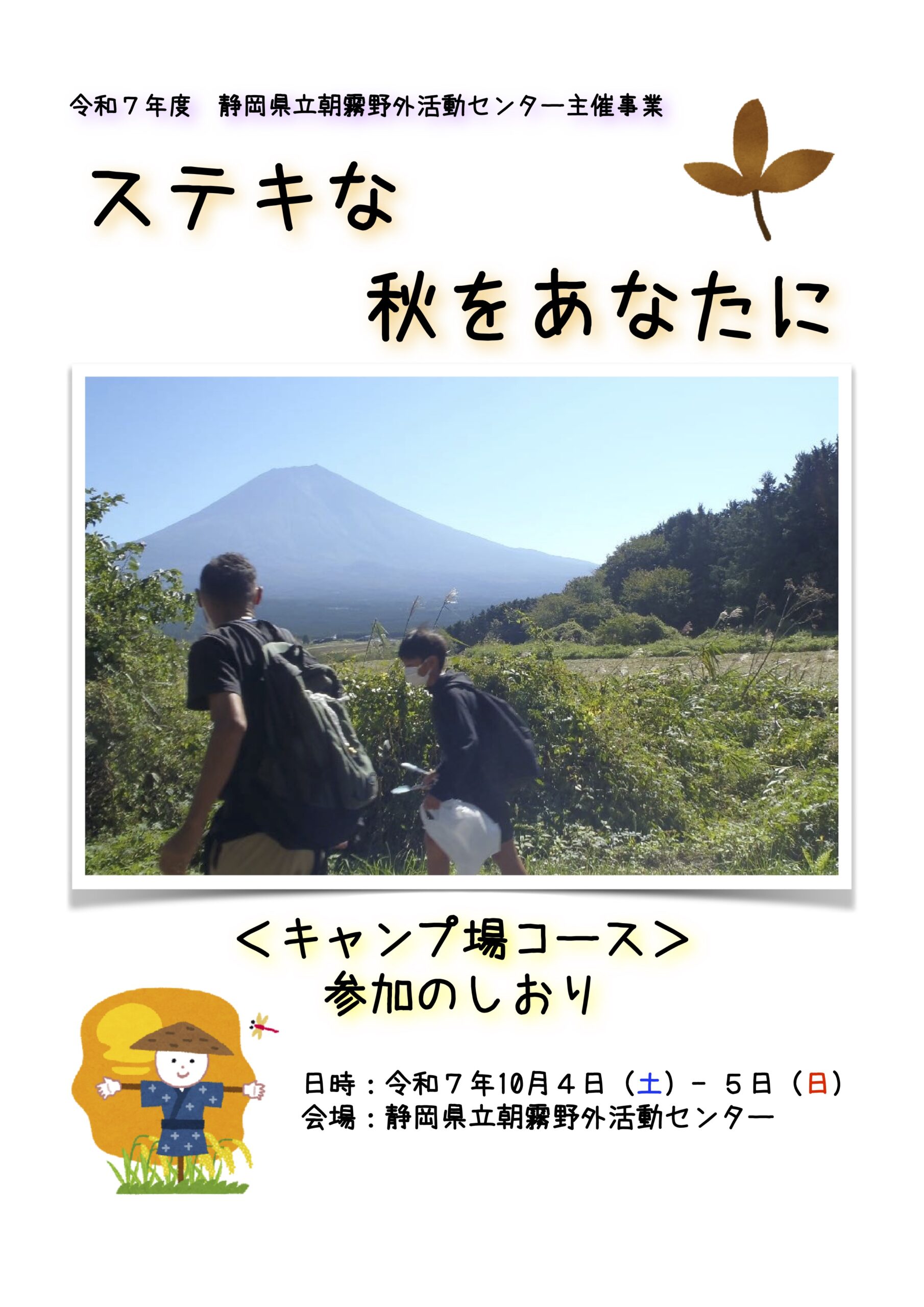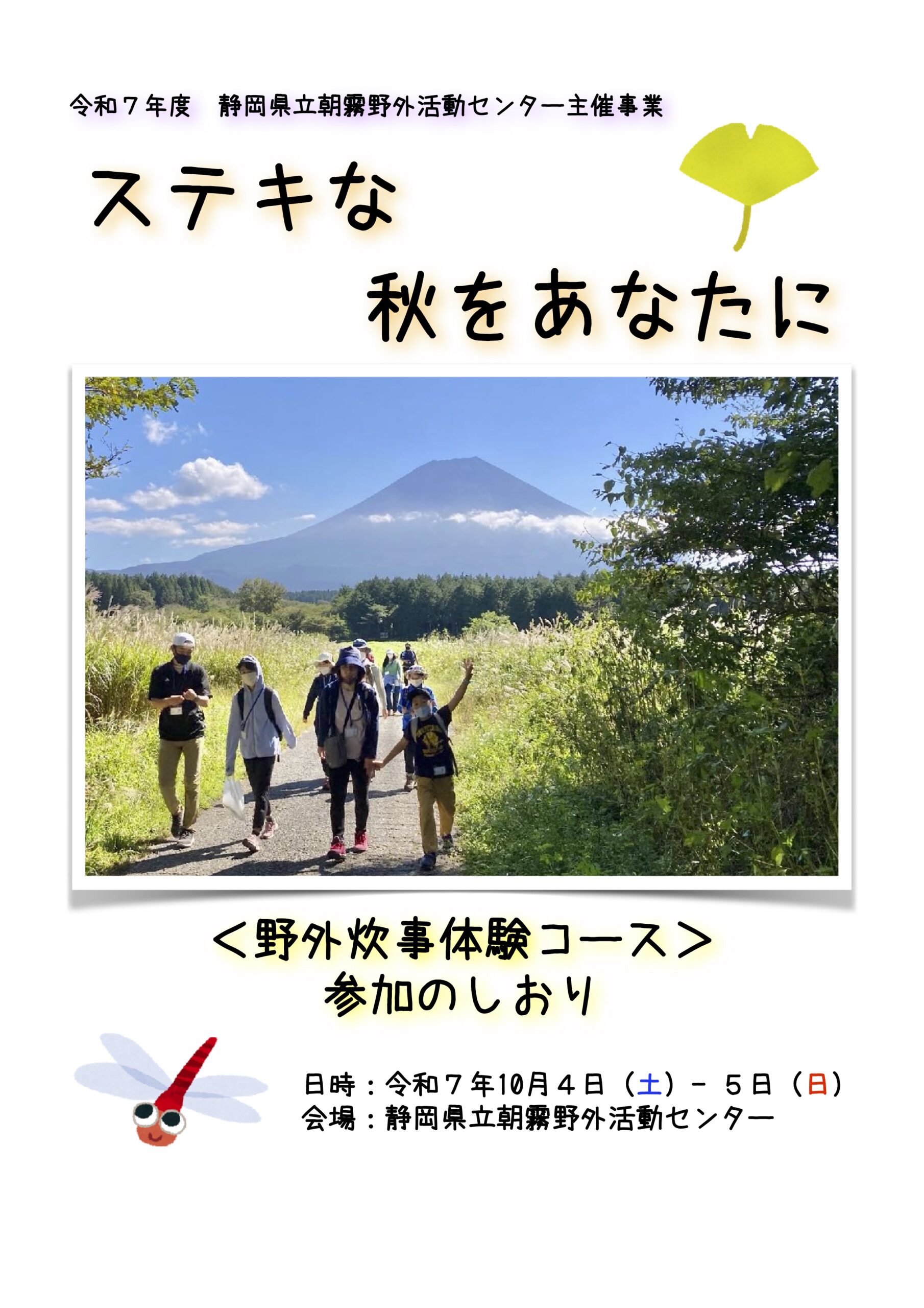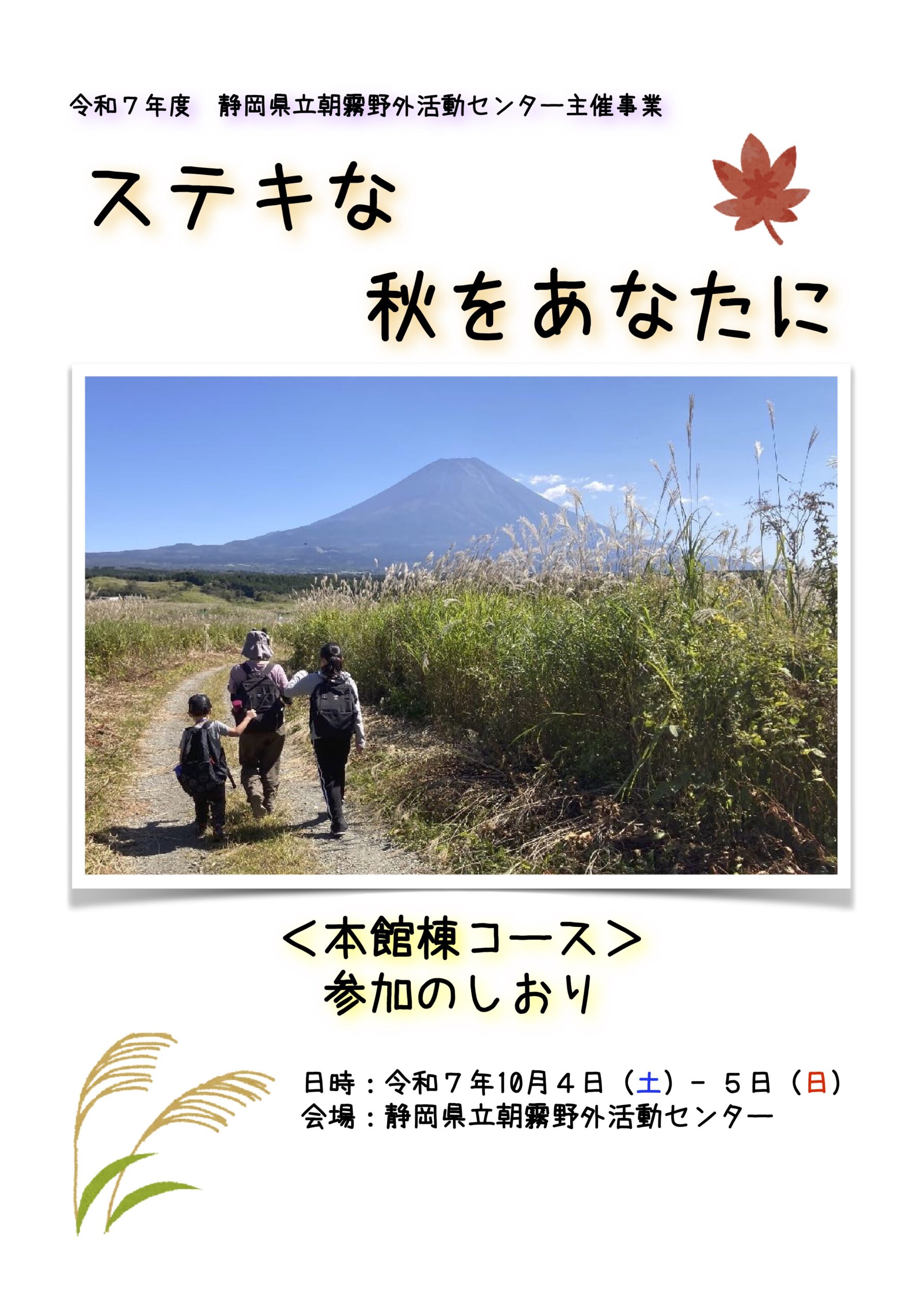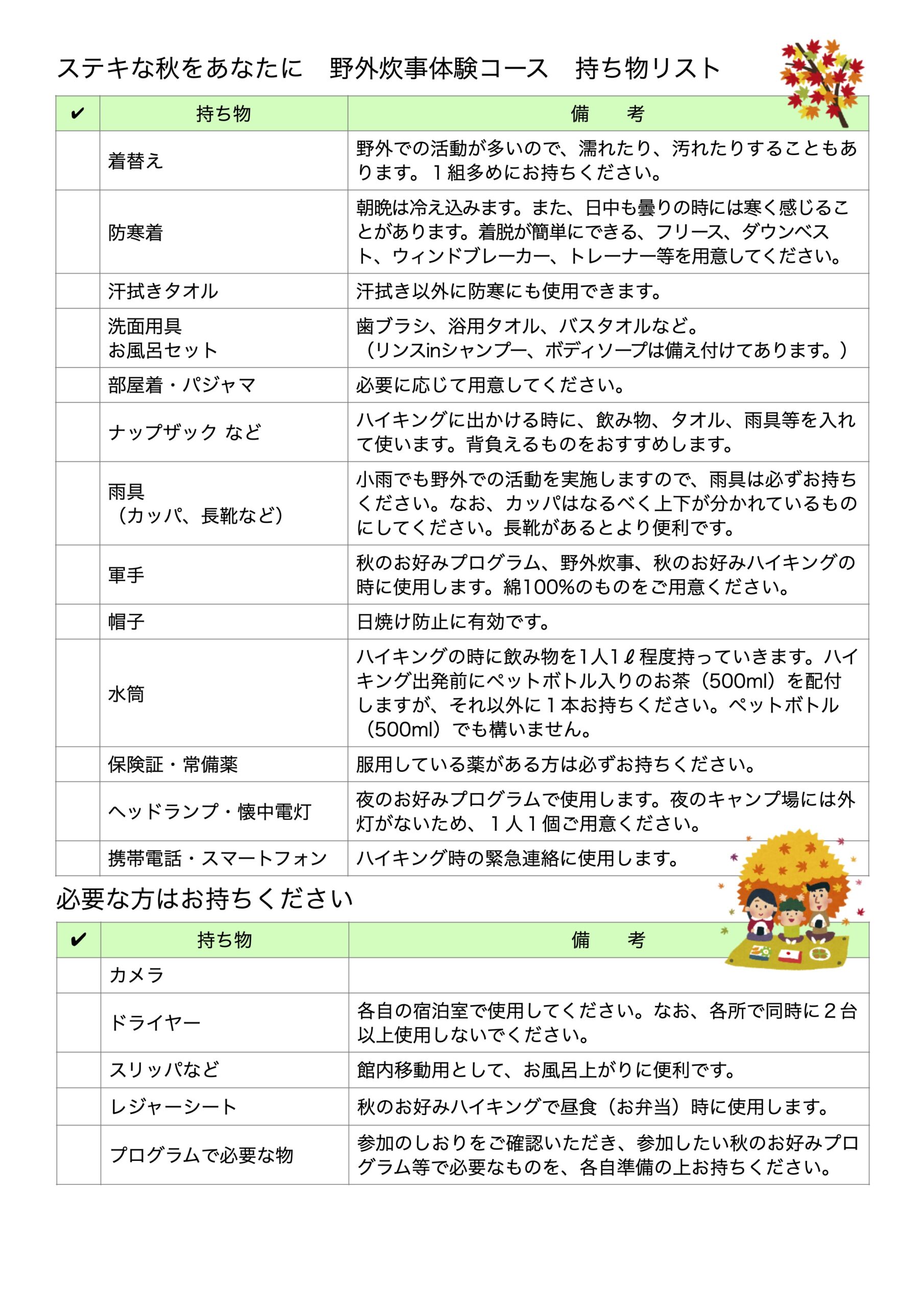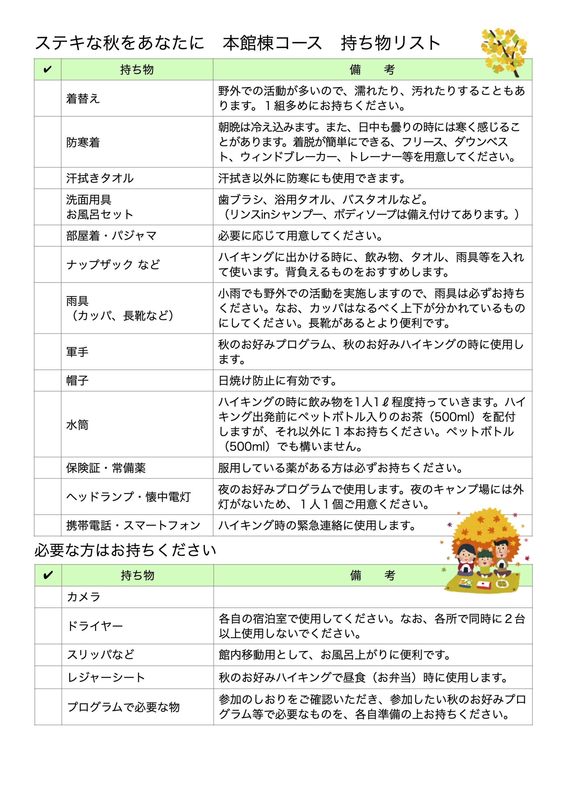 『ステキな秋をあなたに』の活動プログラムは、全て選択制です。「しおり」、「持ち物リスト」、「会場案内図」をご覧いただき、参加したい活動プログラムやハイキングコースについて、事業当日までご家族で話したり、持ち物を準備したりしながらお過ごしください。