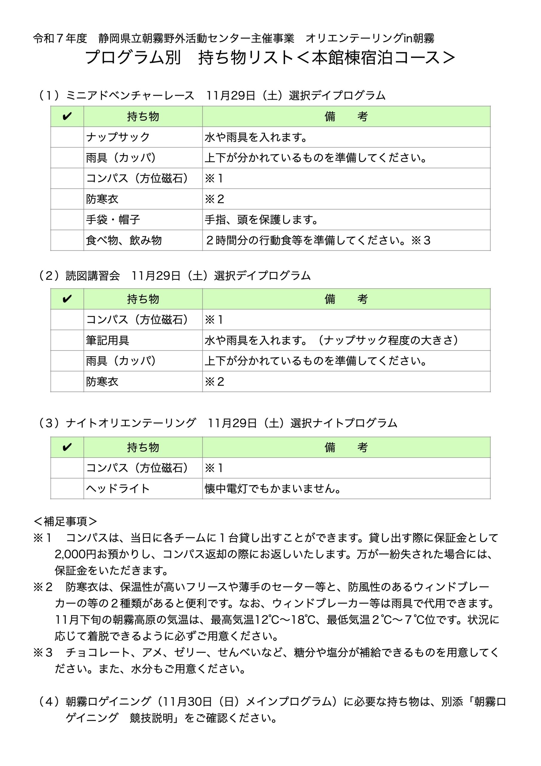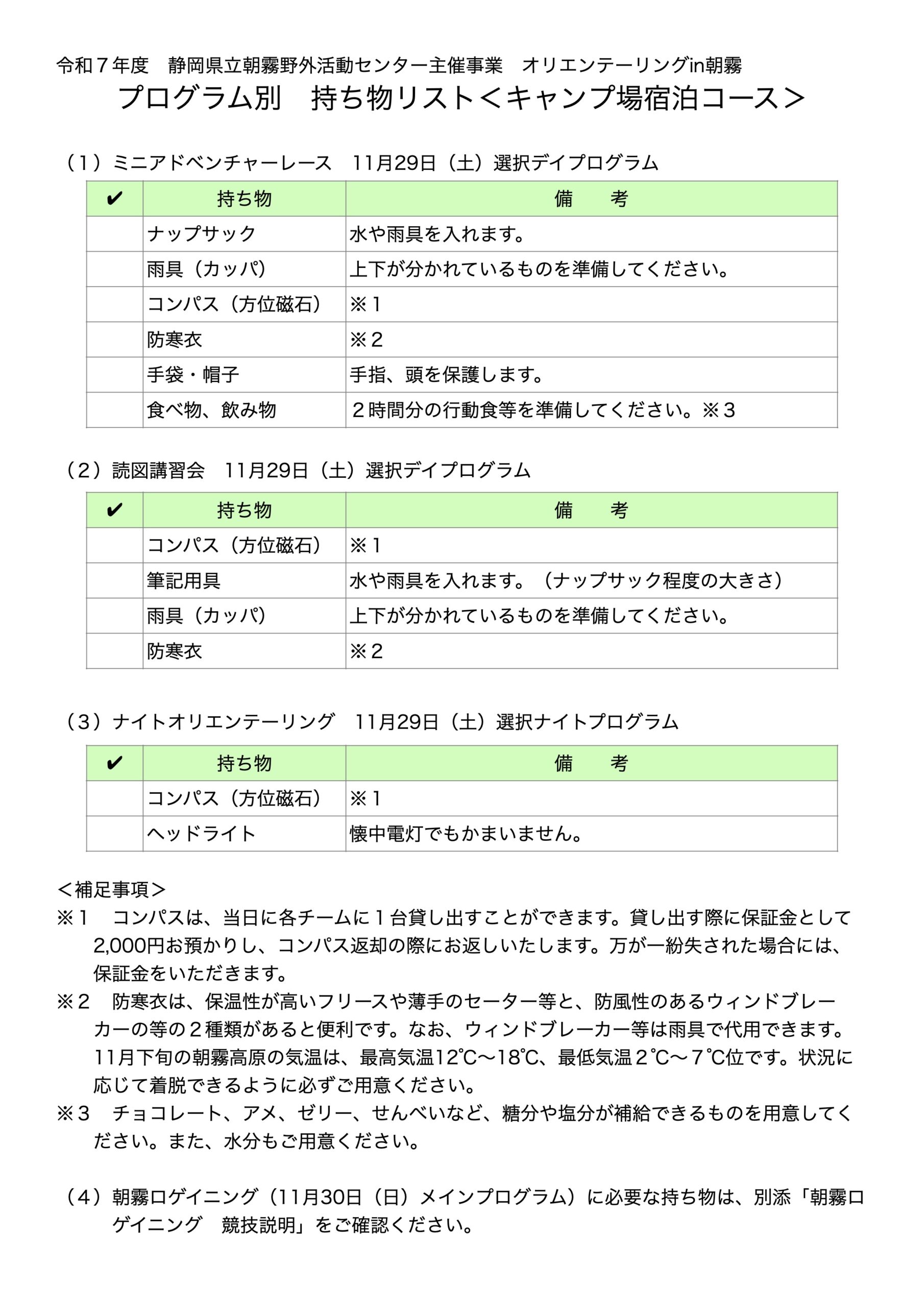 ※朝霧ロゲイニング(日帰り)の持ち物リストは、「競技説明」に記載されております。「競技説明」をご確認ください。
